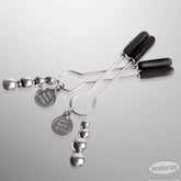 Firm-but-gentle, these adjustable clamps pinch the nipples with just the right amount of pressure to slowly build a warming sensitivity that blossoms into a titillating ache. Swaying from each tweezer clamp is a string of metal weights, causing further sensation to resonate through your nipples with every subtle movement. Soft silicone diffuses the severity of these clamps, offering a cushioned bite that allows pressure and movement to be the focus of your play. Full control is ensured courtesy of the adjustable fit of the clamps, so the pinch is never too much but always enough. The grip is easily adjusted during wear for instant release, or to further intensify your play. Ideal for use as part of progressive sensory play, your erotic response can be deepened by pulling on the weights or using a vibrator to send delicious shivers through your sensitized nipples.